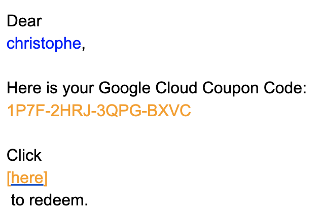 3. Following the link in the confirmation email, you will receive another email from Google Cloud Notifications with a Google Cloud Coupon Code and a redeem link: